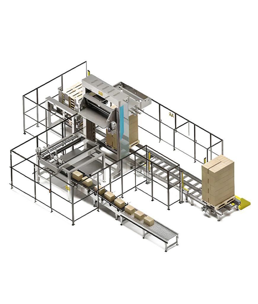 A compact and fully automatic palletizing system for cartons, bags, trays, and shrink-wrapped product designed for stable stacking and seamless end-of-line integration.